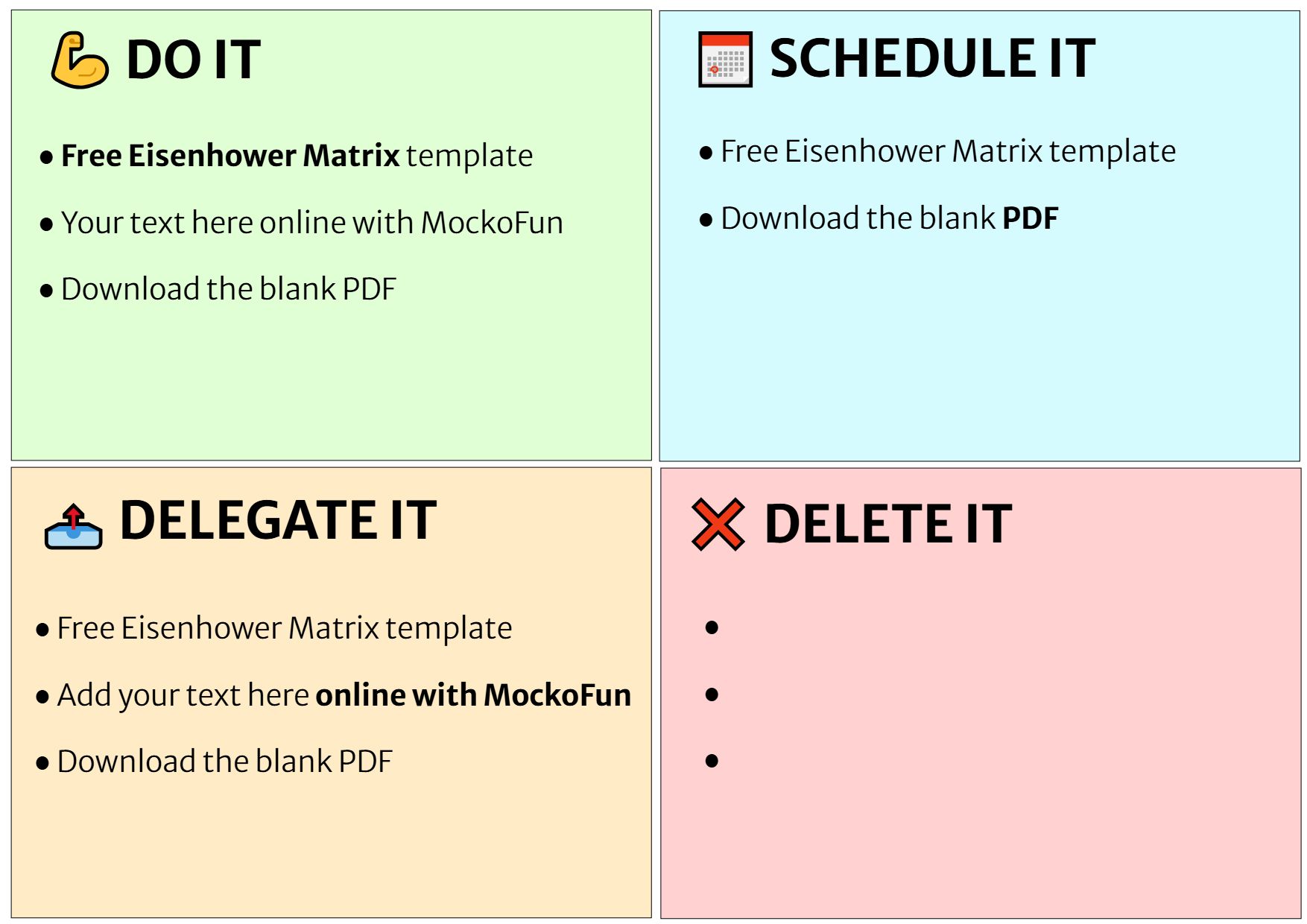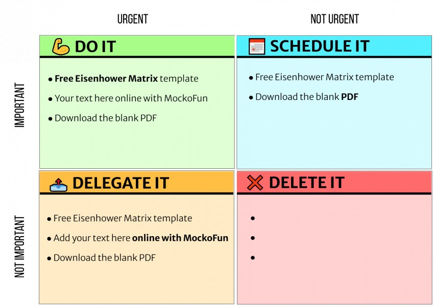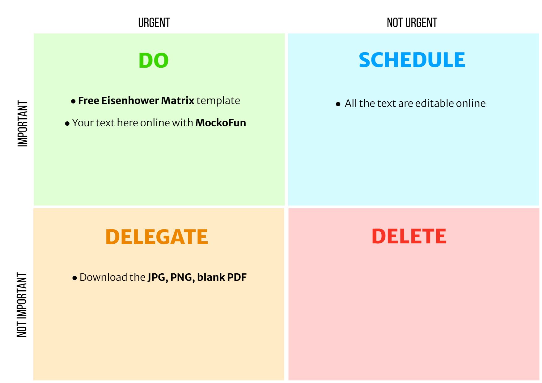 Eisenhower matrix template free download as PDF, JPG or PNG that you can use to organize tasks clearly and boost productivity. Edit the important urgent chart online in MockoFun.