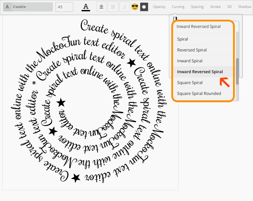 The spiral text maker is easy to use and customize. Try the spiral text creator and get creative. If you don’t know how to swirl text in Illustrator or other complicated tools, use MockoFun. The swirl text effect is easy to customize using your text message, fonts and colors.
